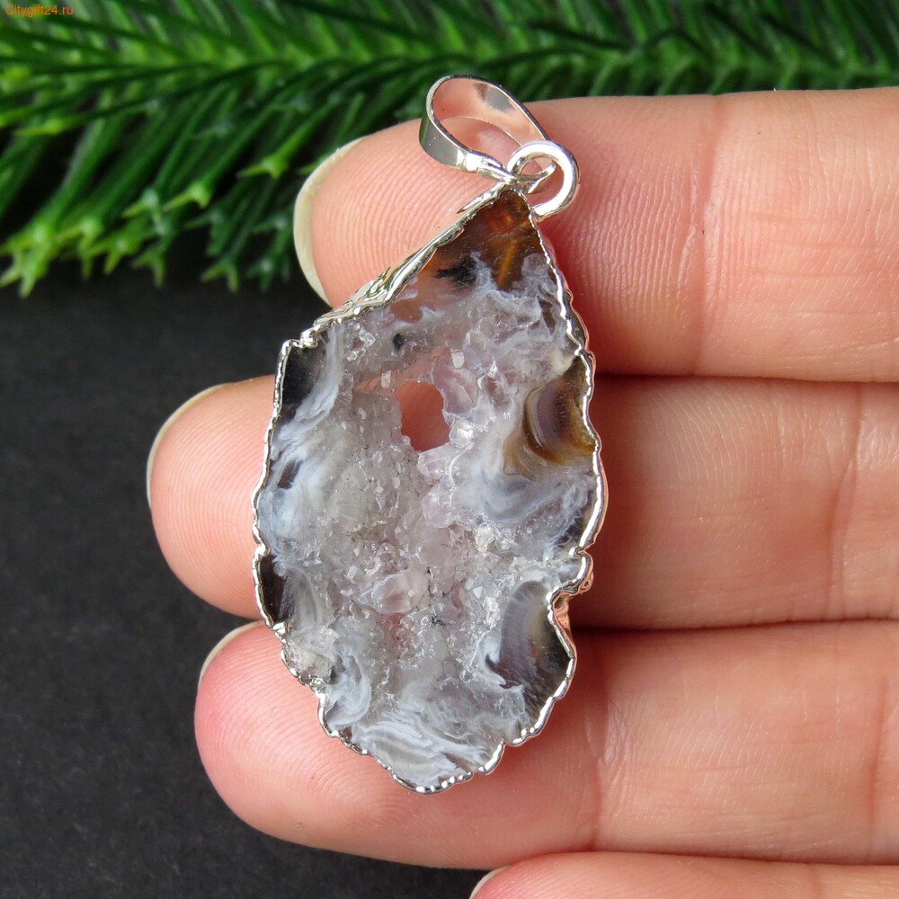 Подвеска бразильский агат с гальваническим покрытием серебристого цвета.