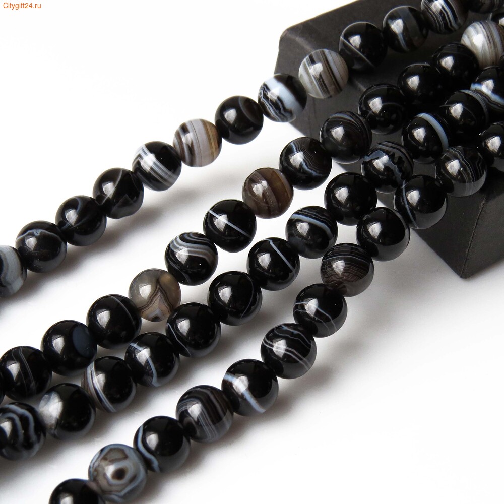 Бусины агат чёрный полосатый, форма гладкий шар.